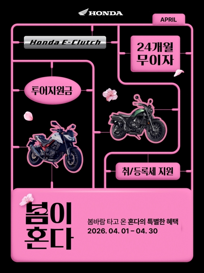 4월 펀 모델 프로모션은 대형 모델 총 13종을 대상으로 진행된다. 2025년식 레블1100 DCT, 레블1100 MT, CB750 호넷, 레블500, 아프리카 트윈(DCT 및 Travel Package 트림), NT1100, CL500, CBR500R은 24개월 제휴금융 무이자 할부(또는 최대 175만 원 할인)와 투어/용품 지원금 최대 100만원을 지원한다. 2025년식 레블1100 SE은 24개월 무이자 또는 100만원 할인 혜택 중 선택할 수 있다.