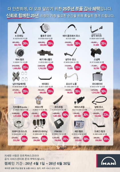 [오토모닝 정영창 기자] 만트럭버스코리아(이하 ‘만트럭’)가 창립 25주년을 맞아 고품질 순정 부품을 합리적인 가격으로 제공하는 ‘만트럭버스코리아 25주년 부품 캠페인’을 실시한다. 만트럭은 그동안의 고객 신뢰에 보답하고 최근 고유가로 가중된 운행 부담을 완화하기 위해 이번 캠페인을 마련했다.