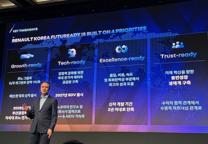 그는 "르노코리아는 퓨처레디 전략 아래, 2028년 부산공장에서 르노의 차세대 전기차 생산, 그리고 2027년 SDV 출시 및 AIDV로의 도약을 준비하고 있다"면서 "이를 위해 생산 경쟁력 강화를 위한 국내 전기차 배터리 공급망과 수평적 파트너십 아래 동반성장 생태계를 구축하겠다"고 밝혔다.