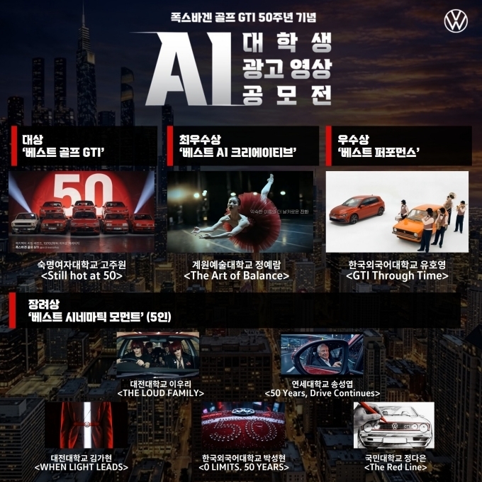 [오토모닝 정영창 기자] 폭스바겐코리아가 올해 골프 GTI 탄생 50주년을 맞아 대학생을 대상으로 한 ‘골프 GTI 대학생 AI 영상 광고 공모전’을 성공적으로 마무리하고 최종 수상작을 발표했다.
