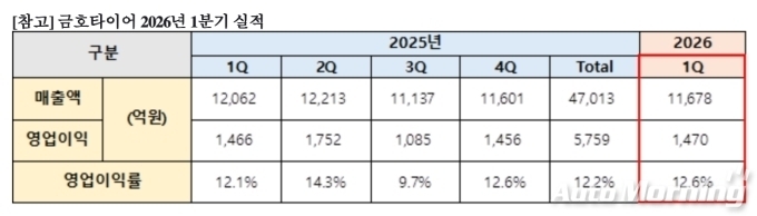 금호타이어는 미국 관세 적용, 중동 전쟁 등 비용 증가 요인이 발생하고 있으나 글로벌 매출 확대 및 고수익 제품 중심의 질적 성장이 지속되고 있다.